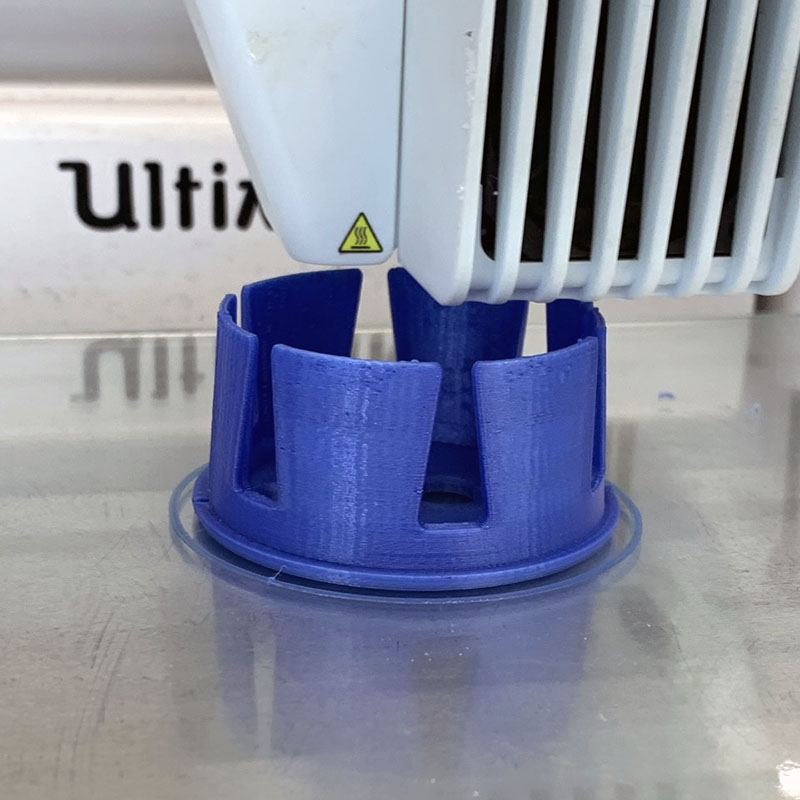 Working with rough measurements from a ruler I started modeling a plug with a hole for each cable. To gain access to pass the cables through I split the model in half. Since the model needs to be able to realign a sphere was used to create a bump on one side and a recess on the other, keeping it symmetrical. The print was prepared, but some dimensions of the stand were bothering me, so I took one of my stands over to the makerspace to use one of their digital calipers to get more accurate measurements. While some of my measurements were close, I was disappointed to have my suspicions confirmed that the opening was not a straight hole and instead tapered as it went. Justin, the manager in the makerspace, offered to help measure the opening using the Zeiss Contura. Similar to the probe used by the CNC mill to obtain precise coordinates, this operates to locate a point in X, Y, and Z planes. With the companion software, the user can specify what shape is being measured and it will construct a model of that shape. For example, my stand has a curved front and rear face. By telling the software that it should treat the points it receives as a cylinder and touching points along the face the software will reconstruct those points into the cylinder and report things like radius and angle of lean. This is very helpful when trying to recreate the stand in a model.