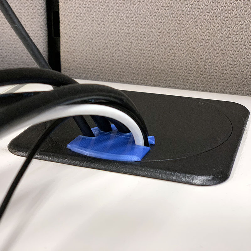 Last week I was cleaning up my desk at work. My work computer is a laptop which is great for portability. In the office, however, I have 3 monitors and various external devices to connect to make it more comfortable. Our desks come with pretty standard plastic grommets and cable passthrough caps. My main problem is that when I unplug my laptop there are 5 cables to disconnect (power, 2 mini display port, USB and a headphone extension). As I am unplugging these cables, I have to make sure that none of them fall through the oversized cable hole. While this certainly isn't a big issue, I saw it as an opportunity to solve a real word problem using some 3D modeling and additive manufacturing.