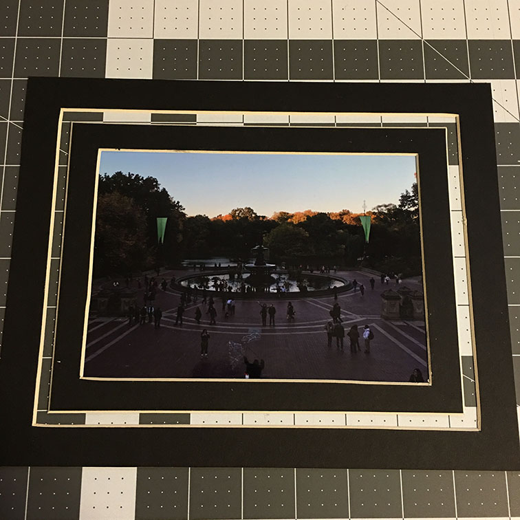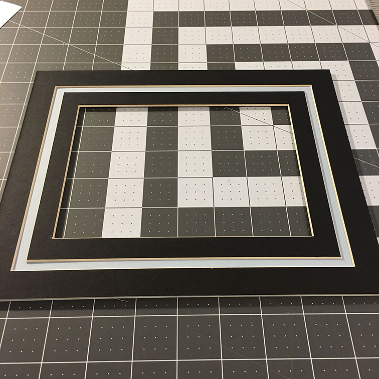 Once I had my design, I printed my digital photos at Costco and returned to the art store where I bought my mat cutter years earlier. Picking up some large pieces of matboard in a few different colors, I went home and set to work. I have found mat cutting to mostly be about patience, careful transfer of guidelines to the back of the mat, and a sharp cutter. In this project, my black mat actually ended up being the most complicated. Since I was making multiple mats I laid out a basic grid of my finished sizes, to be cut with a regular X-acto hobby knife. Then I laid out my internal cut lines for my mat cutter. The hardest part here is remembering which way the bevels are meant to go. Working from the back of the board means that the cut happens on the inner dimension. For a traditional mat, you are always lining up the straight edge on the mat portion of the mat and cutting from the window side. My mat was a little more complex, with a traditional window cut in the center, and then facing bevels where the mat would reveal the mat below. Taking no chances I drew little arrows to remind me which way the cuts were meant to go, which totally saved me a time or two.