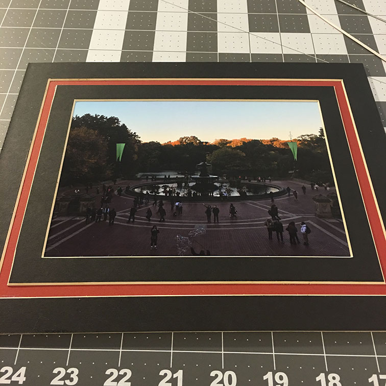 For this particular project, I decided that I wanted to do something a little more custom than a single mat. Double mats can be nice but seemed like overkill for the size of the photos that I was using. Since my girlfriend usually has a limited amount of space and I wanted to do more than one I wanted the frame and mat to fit in an 8" by 10" frame. Using a ruler and a sheet of printer paper I established my 8" by 10" template and arranged the 5" x 7" photo space in the center. Working with the dimensions I came up with the idea to do a color-reveal border. Rather than stepping directly off the photo, there is a band of black mat, then the color-reveal, and finishes with a border of black matboard. Using the mat cutter to establish the beveled edge increases the overall appearance of depth and provides a nice transition between the pieces.