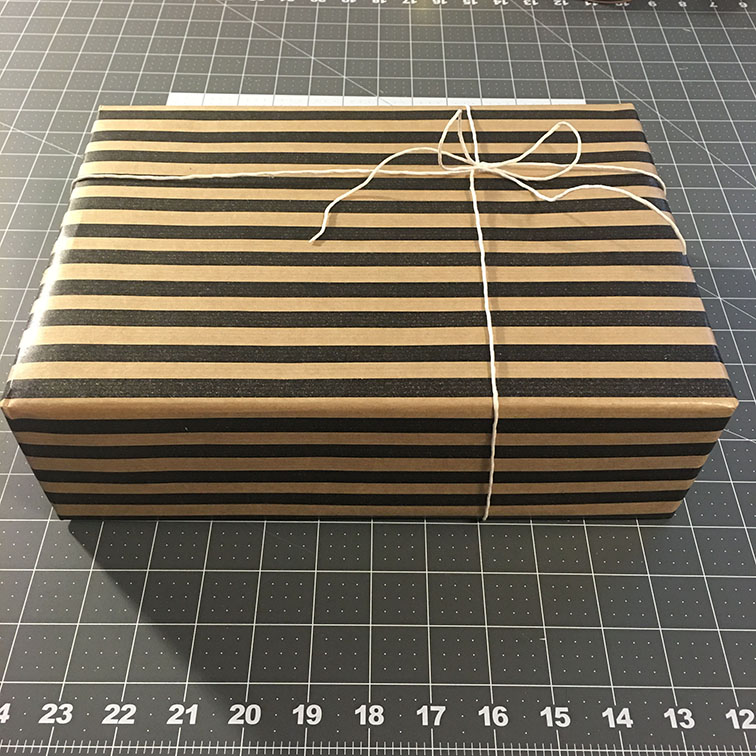 To complete the project the photos went in, the "doors" were taped shut to hold the photos in. I actually only used two photos and the third mat held a promise for a short vacation we took with one of our friends the following February. Because I'm also big into wrapping I found a wrapping paper with a simple black stripe that looked like kraft paper and used a simple twine as a ribbon.