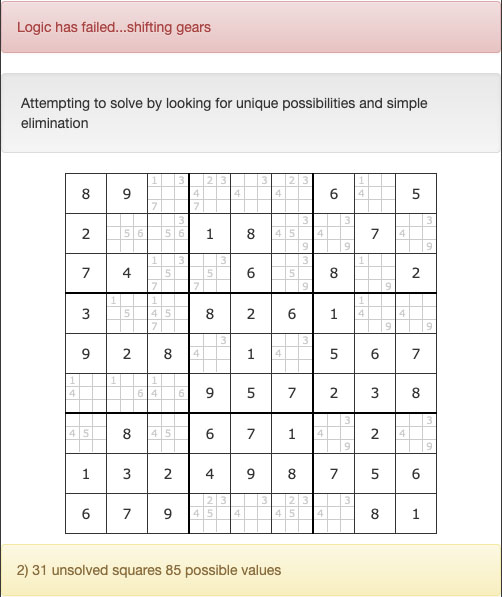 I have to be honest here, the program was probably limited by my own ability to solve the more difficult puzzles, but it works very well on easy and medium difficulty puzzles. The core idea is that unless a value is predetermined, each square has nine potential values. Most easy puzzles are solvable by simple elimination. If a value is already in the same row, column, or sector, it can no longer be a possibility for that square. Once there is only one possibility, that value becomes fixed and the process continues until all squares are fixed. As I said though, this only works for the easier puzzles. Although this same elimination strategy helps with more complex puzzles, a new method is needed. In this mode, the solver looks also at the intersection of possibilities. If you remember your set theory from math... well, then you have a better memory than me. The idea is that it rather than just looking for values that are already used, it now looks for values that can only exist in one location. If a square can be 1, 2 or 3 and no other square has the possibility of being a 3, then that square must be 3. By combining these two methods the solver can now solve many more puzzles. The problem is that for some puzzles, even that is not enough, and for that, the only solution I could find was to use brute force.